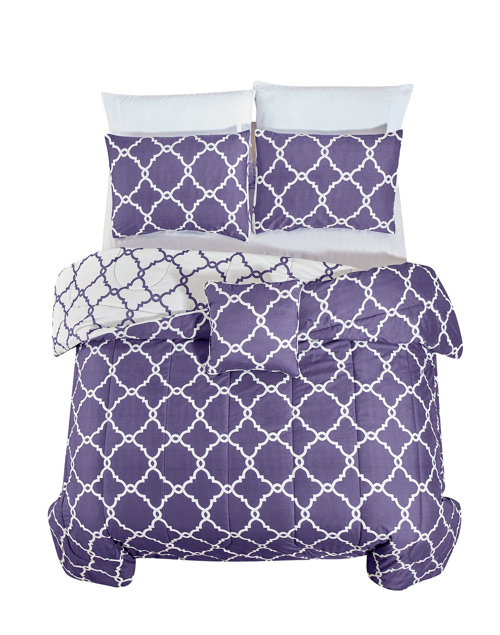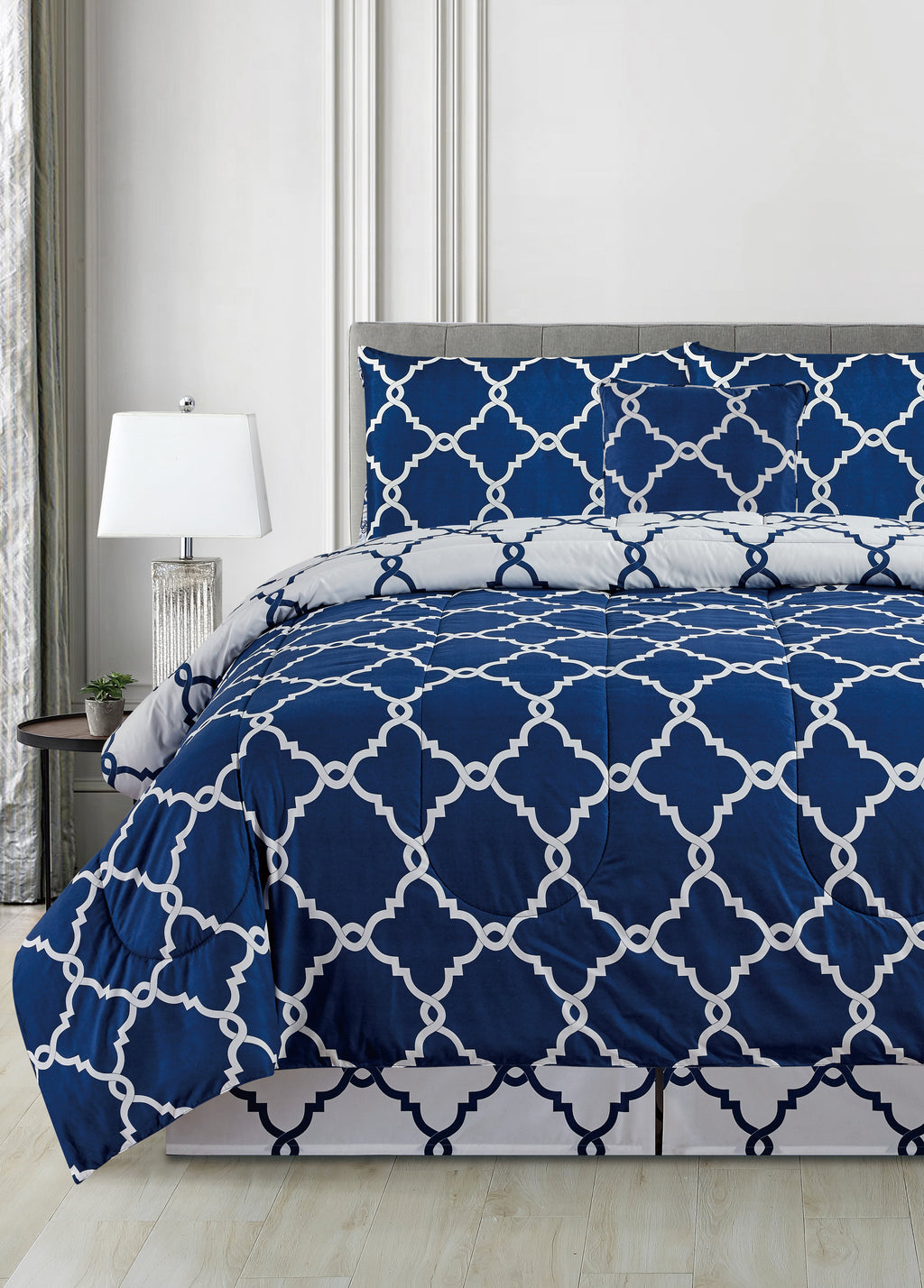 Create a simple, yet chic, look in your room with this navy and white bedding set. It features a fretwork pattern and reverses to white for two stylish looks.
