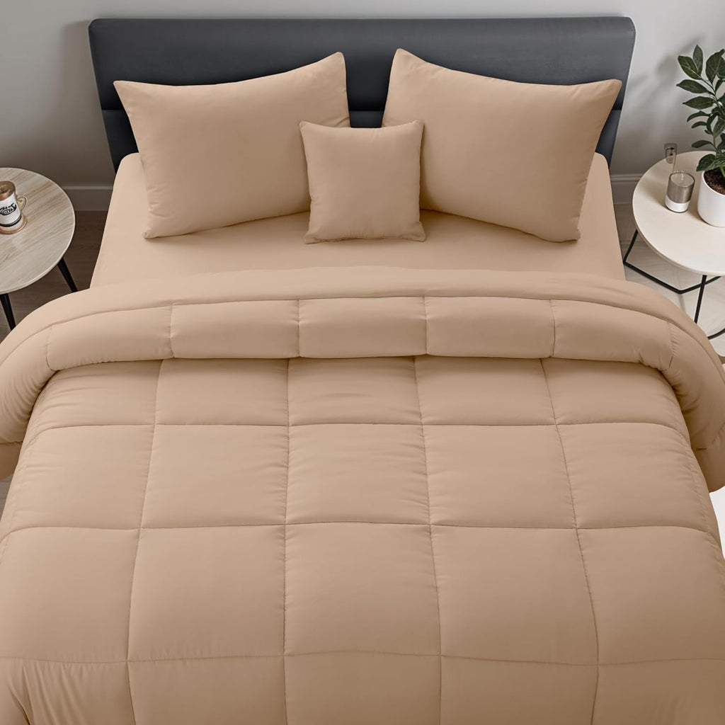 The 5 piece comforter set is the ultimate bedding upgrade. With its luxurious materials and stylish design, this bedding set will transform your sleeping space into a cozy and inviting sanctuary. The set includes a comforter, two pillow shams, and two decorative pillows. All are designed to add a touch of elegance to your bedroom.